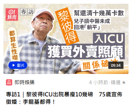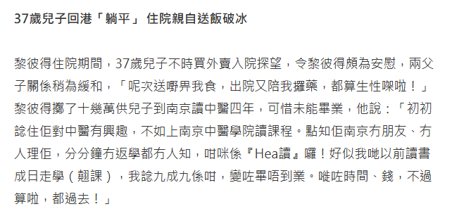 黎彼得没有过度责怪儿子,爆料这一次入院,儿子不时点外卖到医院看望,父子关系稍稍缓和,出院后又陪他去取药,总算是懂事了,虽然钱和时间都浪费掉,但往事已矣,就让它过去吧。